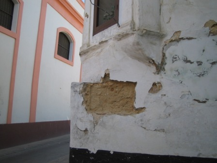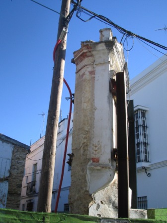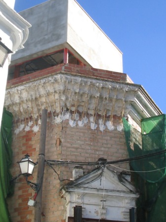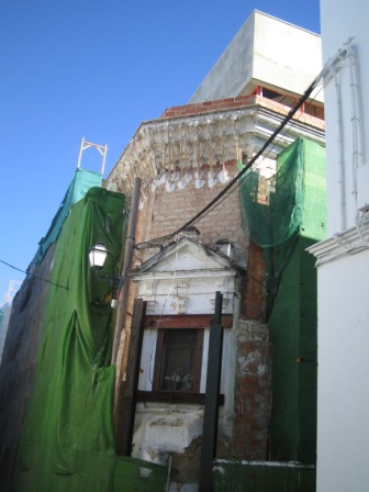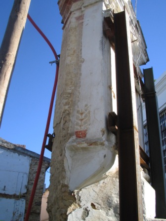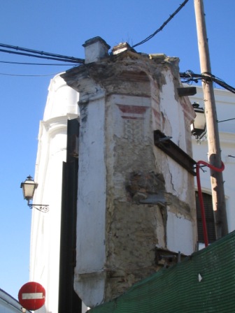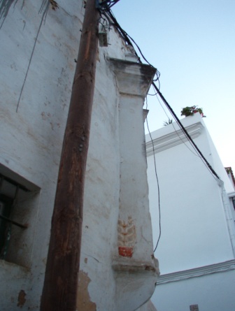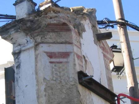 Poco después la empresa apuntaló la capilla de una forma brutal, mediante sendos puntales férreos, que además de agredir la estructura barroca de este interesante elemento de nuestro Patrimonio Histórico, oradaba las hermosas pinturas murales que habían comenzado a emerger al desprenderse las capas de cal que cubrían la Capilla. Estos hechos fueron nuevamente denunciados por el Aula Gerión a la Delegación Provincial de Cultura y en los medios de comunicación (Sanlúcar Información, 11/03/2006).