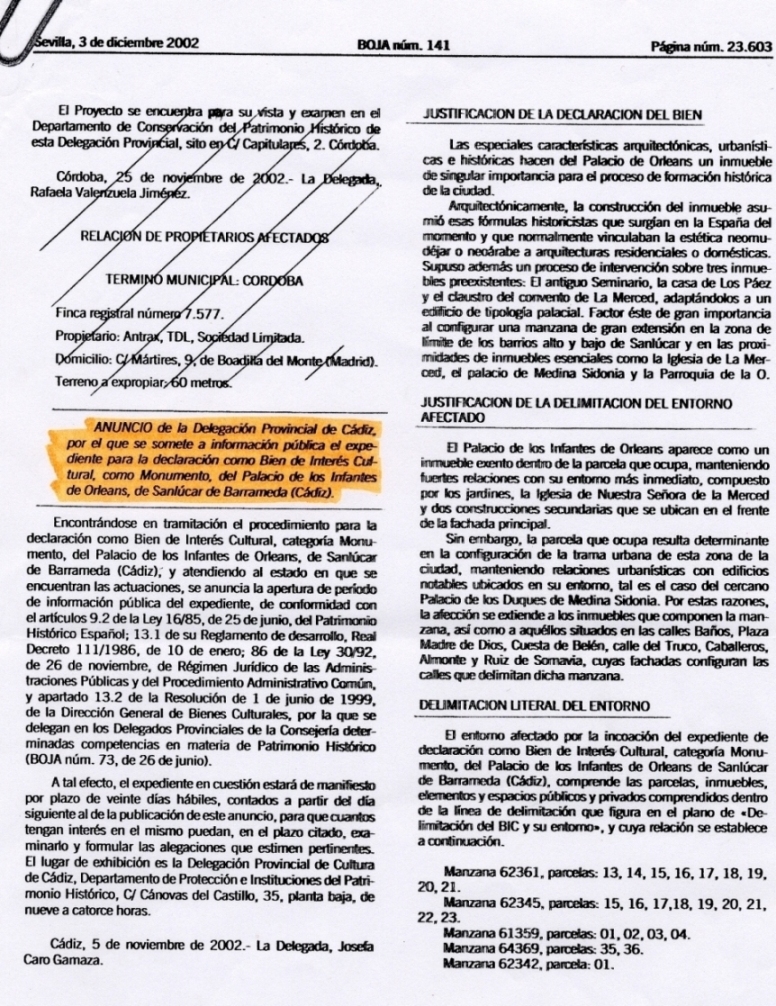 En junio de 2002 fueron declarados Bien de Interés Cultural todos los alrededores del Palacio Municipal. Así, en base a esta declaración, en la calle Caballeros, a todos los inmuebles que hacen frente al Palacio les afecta la misma protección integral. Por ello, el Aula Gerión considera dudosas las “rehabilitaciones” que se están haciendo actualmente en tres casonas de esta calle, como la antigua casa de Mergelina (nº 13, el inmueble contiguo (nº 15) y la casa nº 19, todas ellas protegidas también en el PGOU de modo Global (nivel B). Estas tres casas están en obras y se están produciendo salidas de materiales antiguos; se están realizando rebajes en el pavimento original; se están edificando nuevas alturas; se han realizado demoliciones completas, a excepción del murete de fachada, como en la casa nº 19, etc. Por tanto, según el Aula Gerión, se está faltando a la legalidad vigente, pues no se están respetando las estructuras originales, además de no ejecutarse las prescritas catas arqueológicas, previstas en todo este perímetro de la antigua muralla de Sanlúcar, tal como ordena el PGOU.